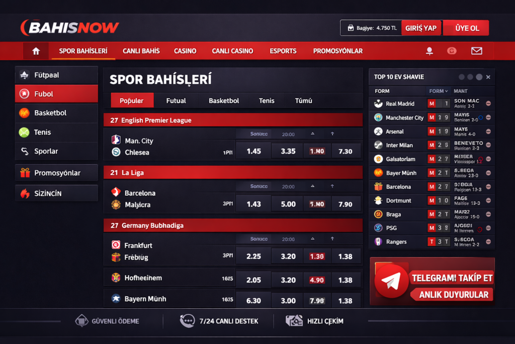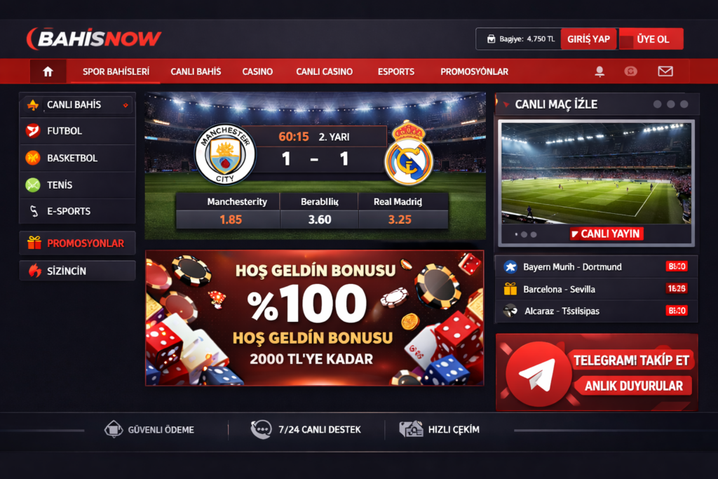 Genel değerlendirme yapıldığında Bahisnow canlı bahis ve canlı maç izleme seçenekleri, siteyi yalnızca bir bahis platformu olmaktan çıkarıp kapsamlı bir spor deneyimi sunan bir yapıya dönüştürür. Maçı izlerken aynı anda bahis yapabilme imkânı, kullanıcıların site içinde daha uzun süre vakit geçirmesini sağlayan önemli bir unsurdur.