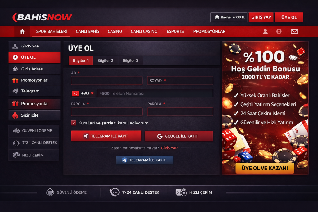 Bahisnow üzerinde yeni üyelik işlemleri, kullanıcıyı yormayan ve kısa sürede tamamlanabilecek şekilde tasarlanmıştır. Siteye ilk kez giriş yapan kullanıcılar için hesap açma süreci sade adımlardan oluşur ve teknik bilgi gerektirmez. Doğru ve eksiksiz bilgilerle yapılan bir üyelik, ilerleyen süreçte yaşanabilecek olası sorunların da önüne geçer.